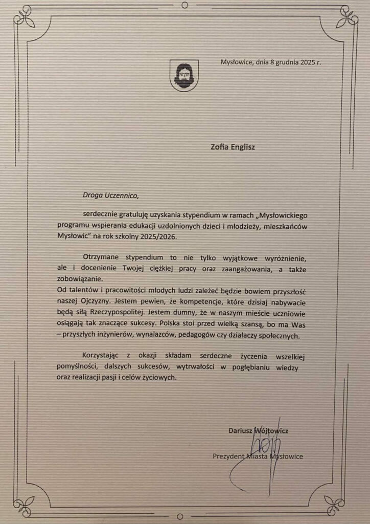 Z ogromną radością informujemy, że nasza uczennica Zosia Englisz otrzymała stypendium w ramach Mysłowickiego Programu Wspierania Edukacji Uzdolnionych Dzieci i Młodzieży!