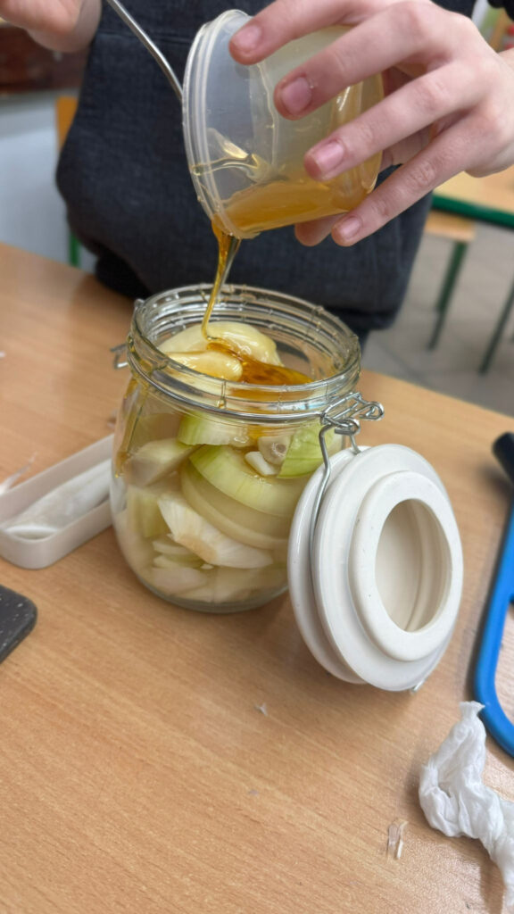 W ramach zajęć o naturalnych sposobach dbania o zdrowie jesienią i zimą uczniowie samodzielnie przygotowali domowy syrop z cebuli. Przy okazji poznali jego właściwości – wspiera odporność, łagodzi kaszel i pomaga w walce z pierwszymi oznakami przeziębienia.