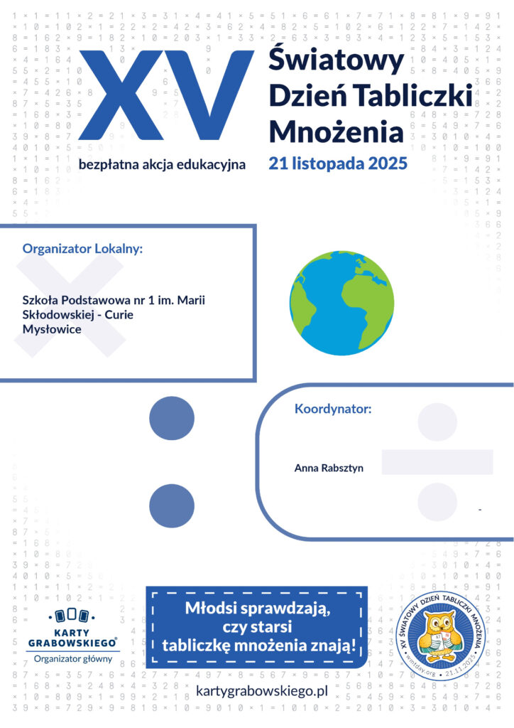 21 listopada 2025 roku na całym świecie będzie obchodzony XV Światowy Dzień Tabliczki Mnożenia.Nasza szkoła również bierze udział w tym wydarzeniu. Z tej okazji nauczyciele matematyki zapraszają uczniów klas III-VIII do udziału w konkursie matematyczno-plastycznym oraz mistrz tabliczki mnożenia. Szczegóły na plakacie